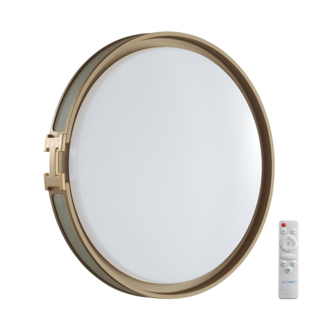 Светильник 7654/EL линии FAVEMO GREY состоит из металлического основания (базы) и пластикового рассеивателя. Материал рассеивателя — высококачественный пластик марки PMMA 2.0 белого цвета с матовой поверхностью. Пластик обеспечивает светильнику равномерное рассеивание и хорошее светопропускание. Форма плафона: круглая, декорирована ободом из искусственной кожи серого цвета. Обод украшен декоративной вставкой в виде пряжки ремня из пластика золотого цвета. Степень защиты IP43 позволяет использовать светильник в определенных зонах влажных помещений. В комплект входит заменяемый LED-модуль с линзами мощностью 70 Вт, соответствующей лампе накаливания 610 Вт, а также пульт ДУ (с креплением на стену), с помощью которого осуществляется плавное изменение цветовой температуры в диапазоне 3000—6000 К, изменение яркости, переход в режим переключения теплого/белого/холодного/ночного света. Светильник имеет функцию памяти.